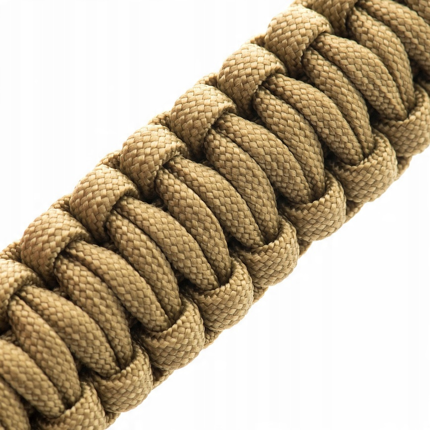 Bransoletka survivalowa firmy M-TAC®, która w rzeczywistości jest zapasem zaplecionej linki spadochronowej. Przydatny gadżet i jednocześnie oryginalna, męska biżuteria. Po rozwinięciu otrzymujemy około 3 m mocnej i wytrzymałej linki. Dzięki zastosowaniu siedmiu nylonowych rdzeni wewnątrz, linka jest w stanie wytrzymać nawet do 200 kg obciążenia.
