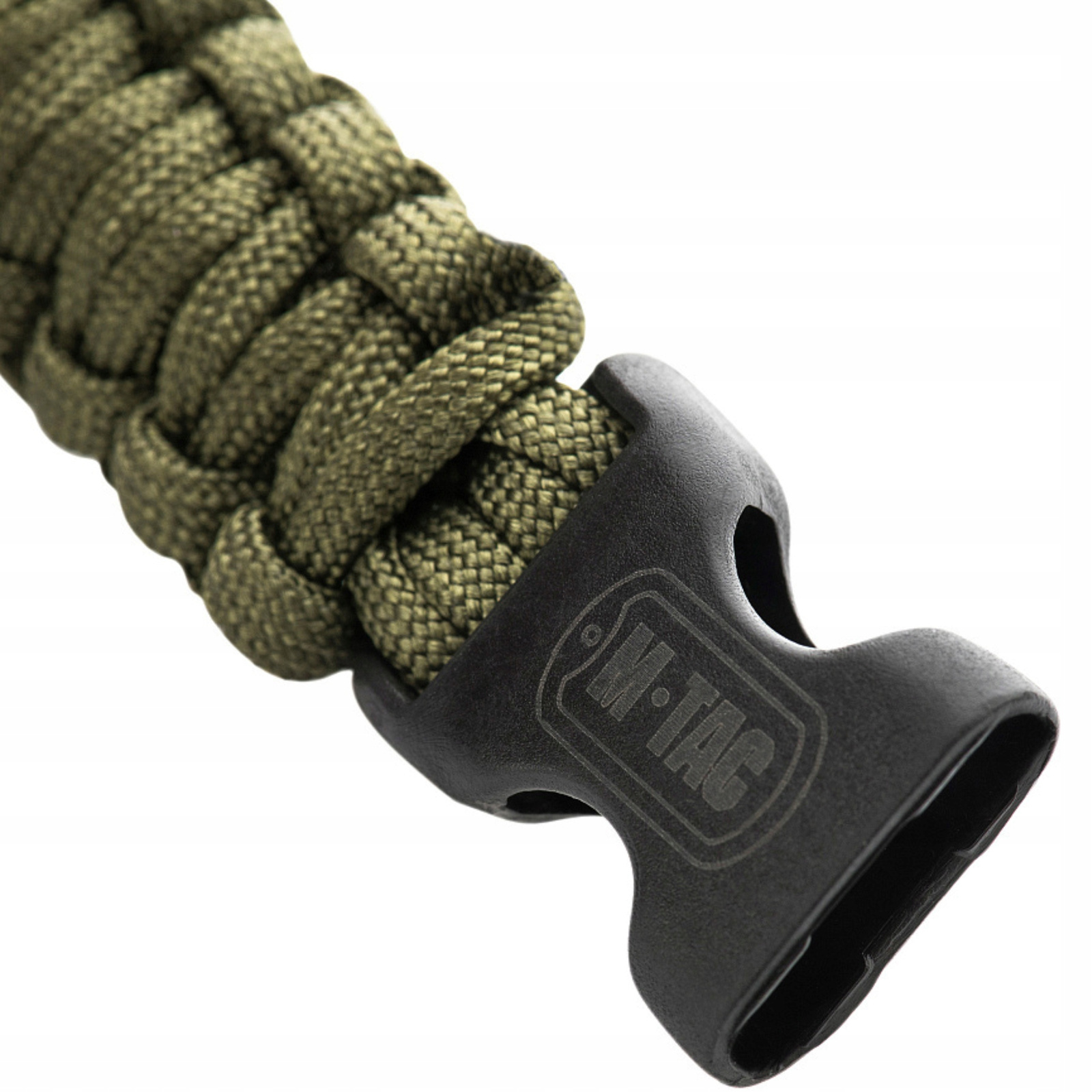 Bransoletka survivalowa firmy M-TAC®, która w rzeczywistości jest zapasem zaplecionej linki spadochronowej. Przydatny gadżet i jednocześnie oryginalna, męska biżuteria. Po rozwinięciu otrzymujemy około 3 m mocnej i wytrzymałej linki. Dzięki zastosowaniu siedmiu nylonowych rdzeni wewnątrz, linka jest w stanie wytrzymać nawet do 200 kg obciążenia.