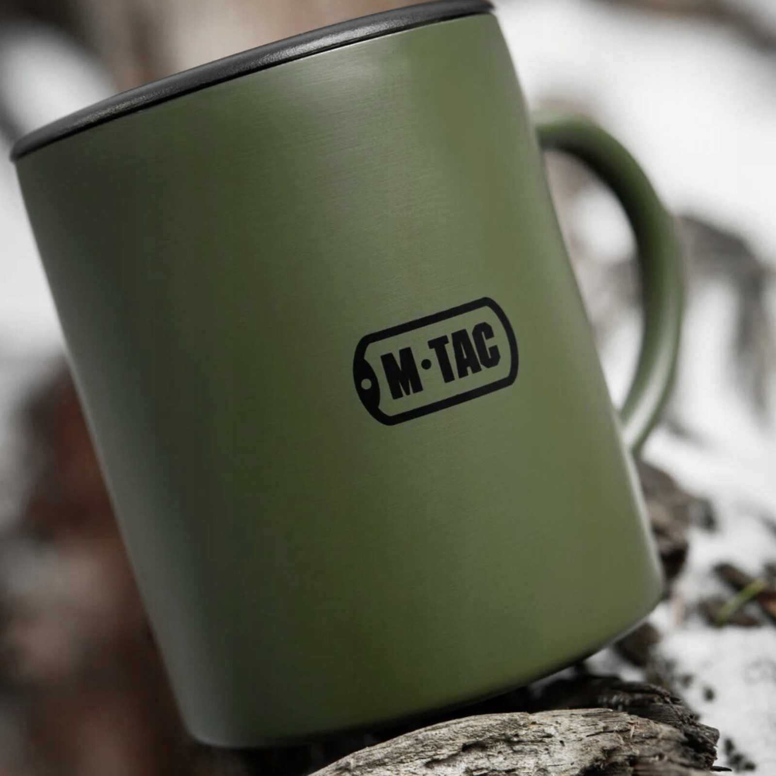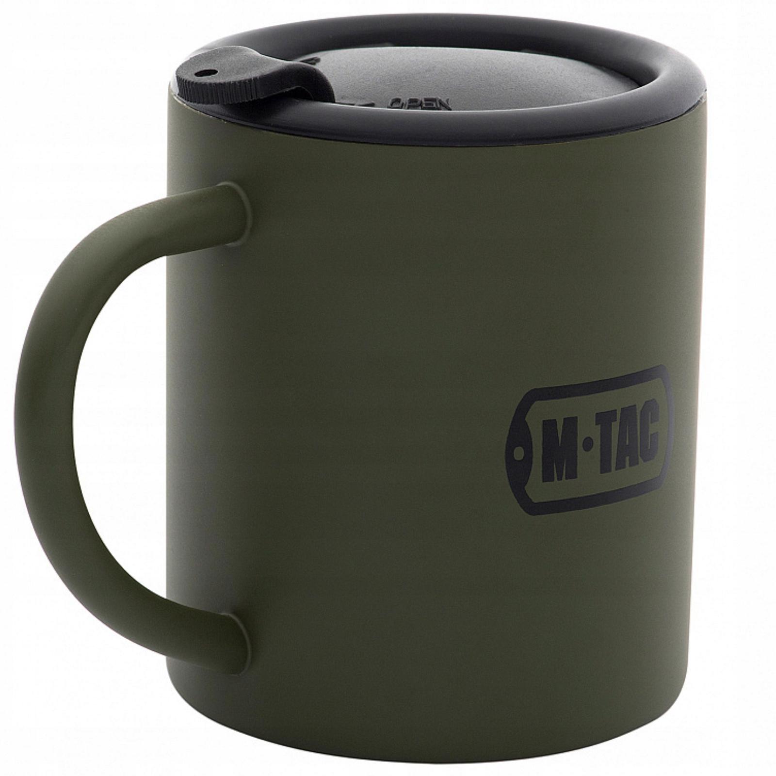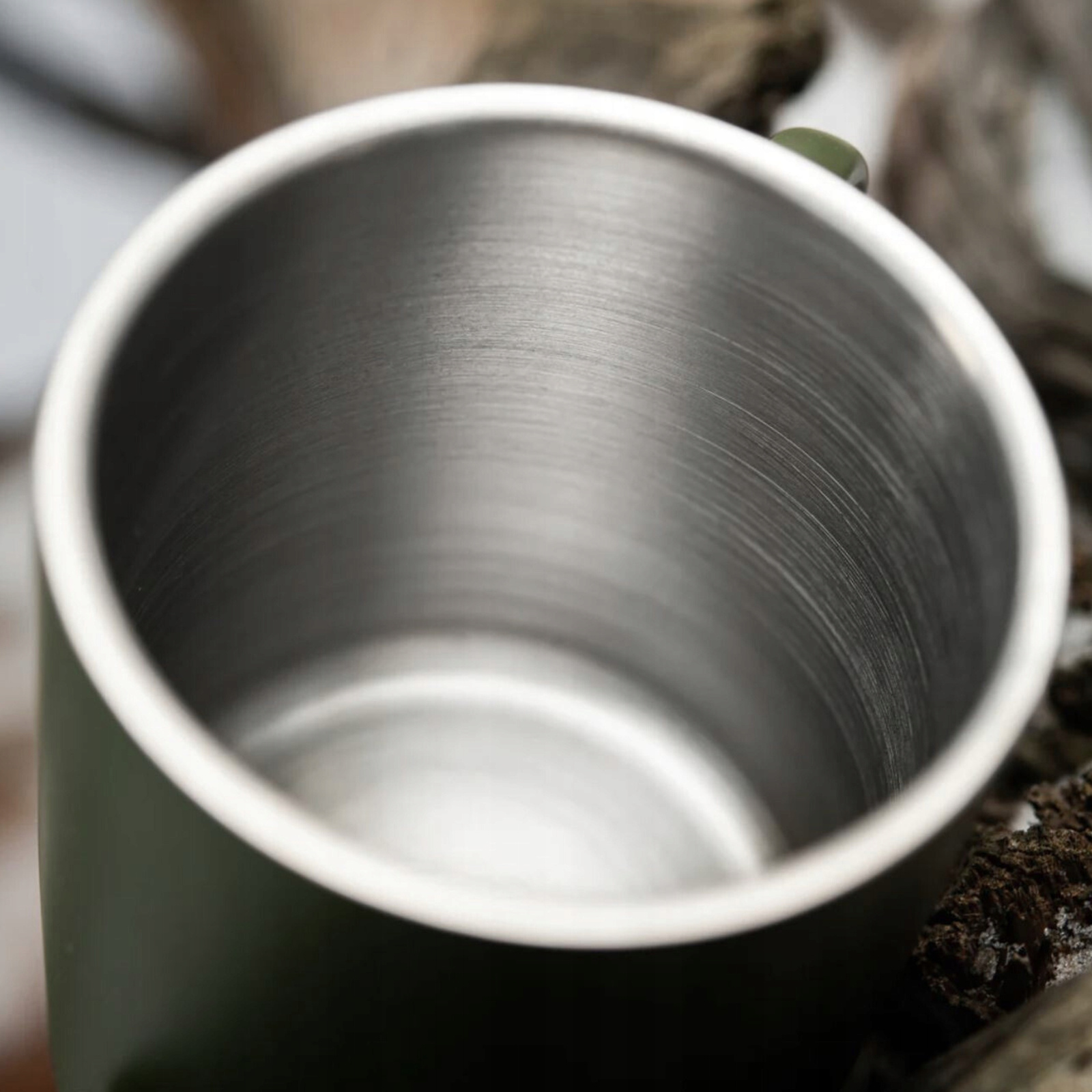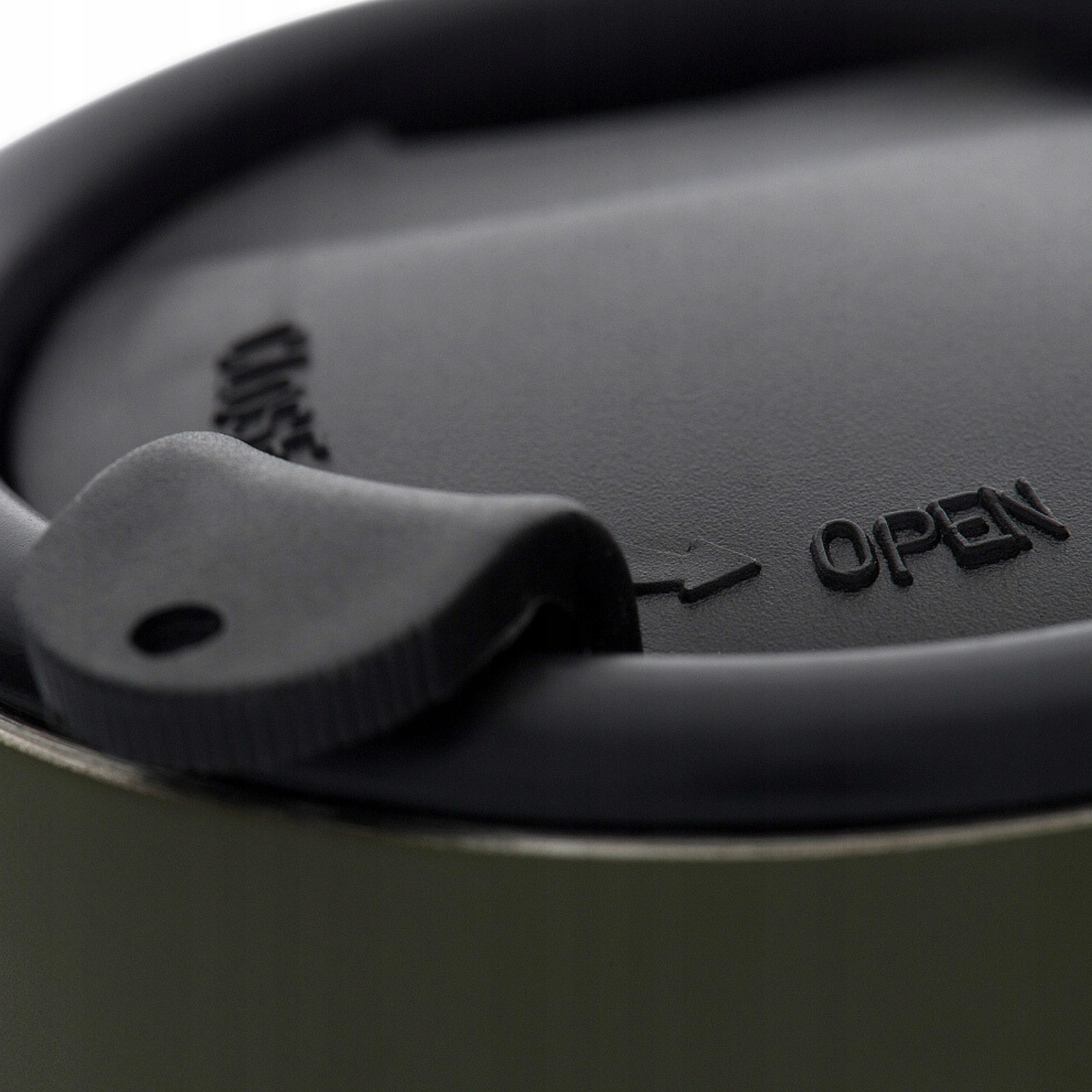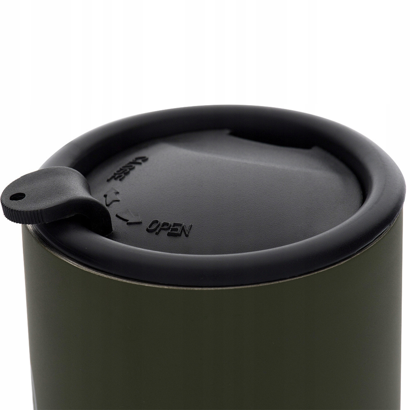 Dodatkowa pokrywka mocowana na kubku posiada uszczelnienie zabezpieczające przed rozlaniem napoju. Dzięki specjalnemu otworowi możesz pić kawę bez konieczności zdejmowania pokrywki, a napój dłużej zachowuje swoją temperaturę. Zewnętrzna powierzchnia pokryta została matową zieloną farbą, która dodaje militarnego charakteru, a także ogranicza powstawanie odblasków, przez co sprawdzi się podczas działań w terenie.