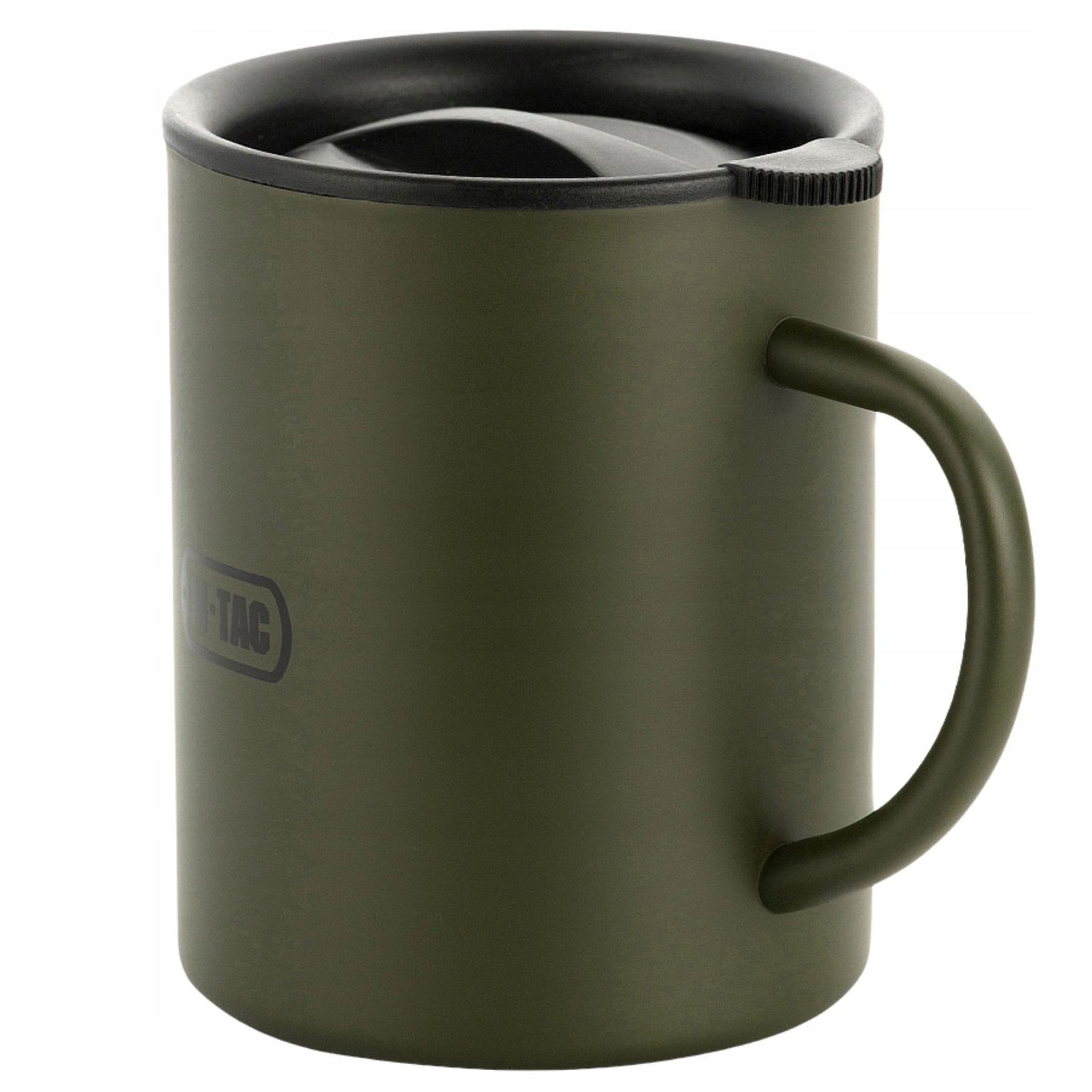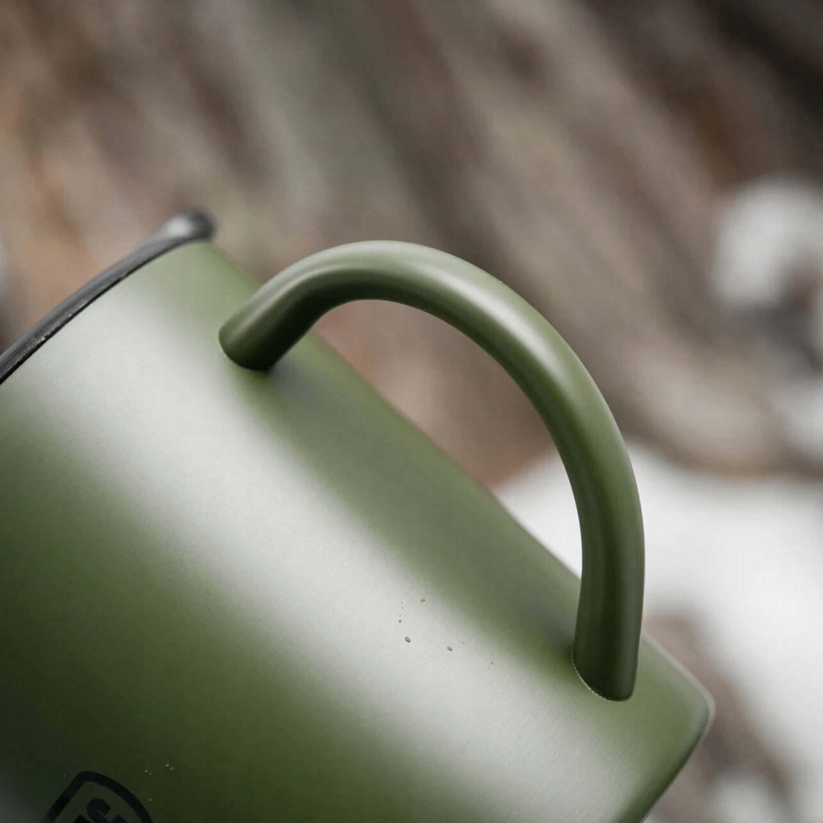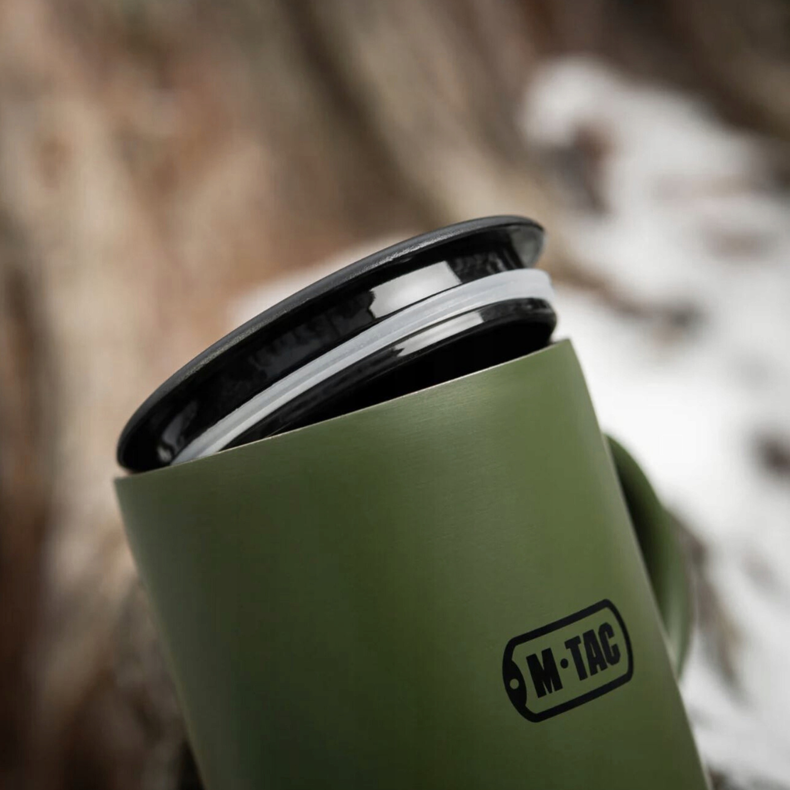 Dodatkowa pokrywka mocowana na kubku posiada uszczelnienie zabezpieczające przed rozlaniem napoju. Dzięki specjalnemu otworowi możesz swobodnie pić kawę bez konieczności zdejmowania pokrywki, a napój dłużej zachowuje swoją temperaturę. Zewnętrzna powierzchnia pokryta została matową zieloną farbą, która dodaje militarnego charakteru, a także ogranicza powstawanie odblasków, przez co sprawdzi się podczas działań w terenie.