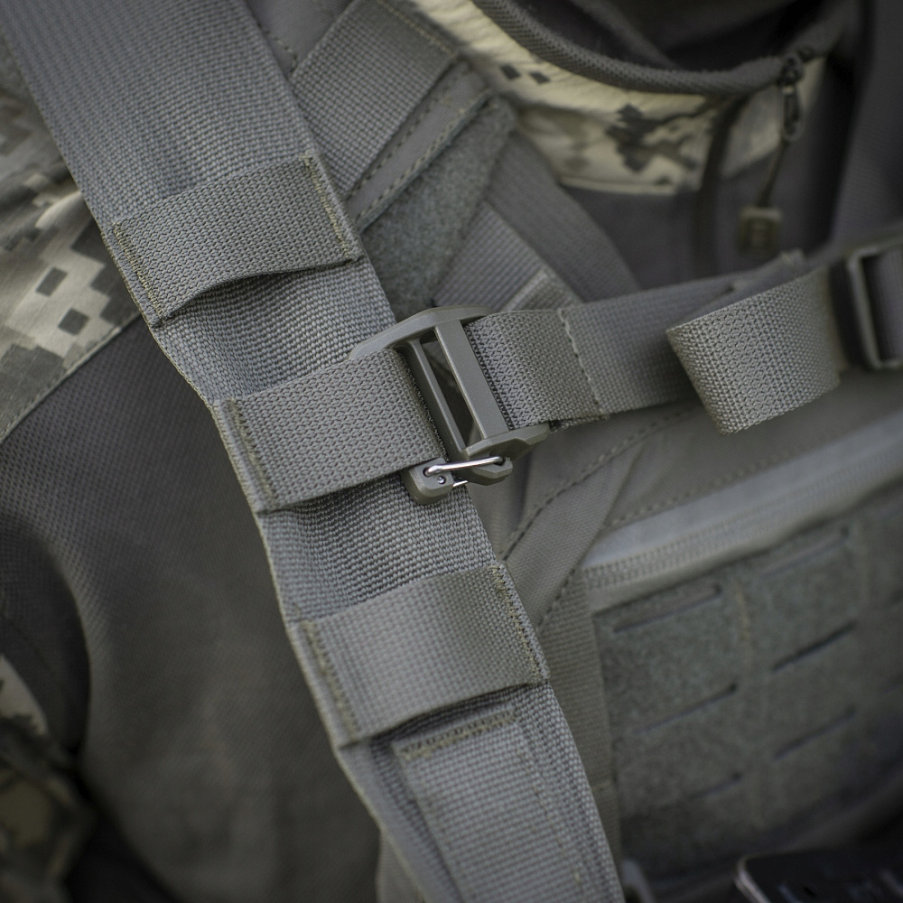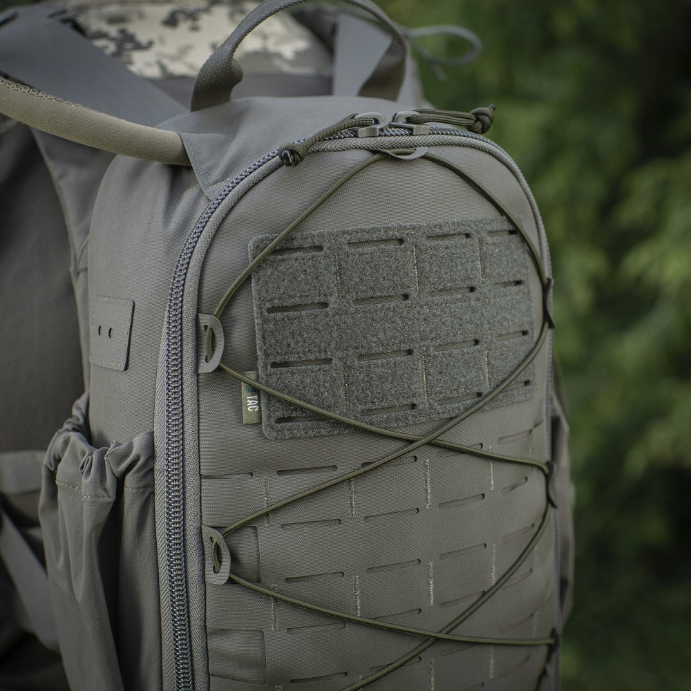 Frontalny panel plecaka został wykonany w technologii Laser Cut z wytrzymałego laminatu Cordura® Squadron. Umożliwia on montaż dodatkowych ładownic i kieszeni w systemie MOLLE/PALS bez zwiększania wagi i profilu plecaka, co ma miejsce w przypadku tradycyjnych, naszywanych taśm.