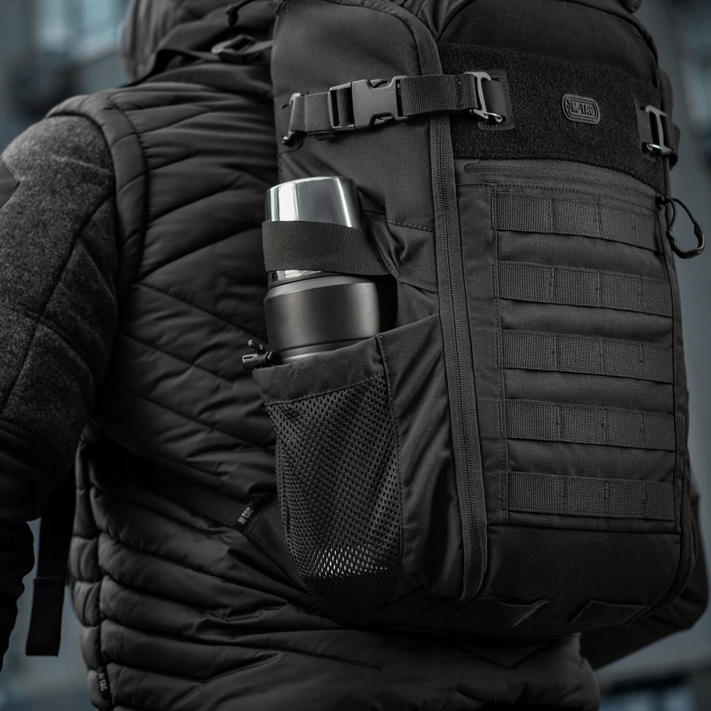 System montażowy MOLLE/PALS na froncie i bokach oraz pasy kompresyjne umożliwiają dowolną rozbudowę plecaka o dodatkowe ładownice i zasobniki. Pasy kompresyjne pozwalają dostosować objętość plecaka do ilości sprzętu, zachowując jego stabilność.