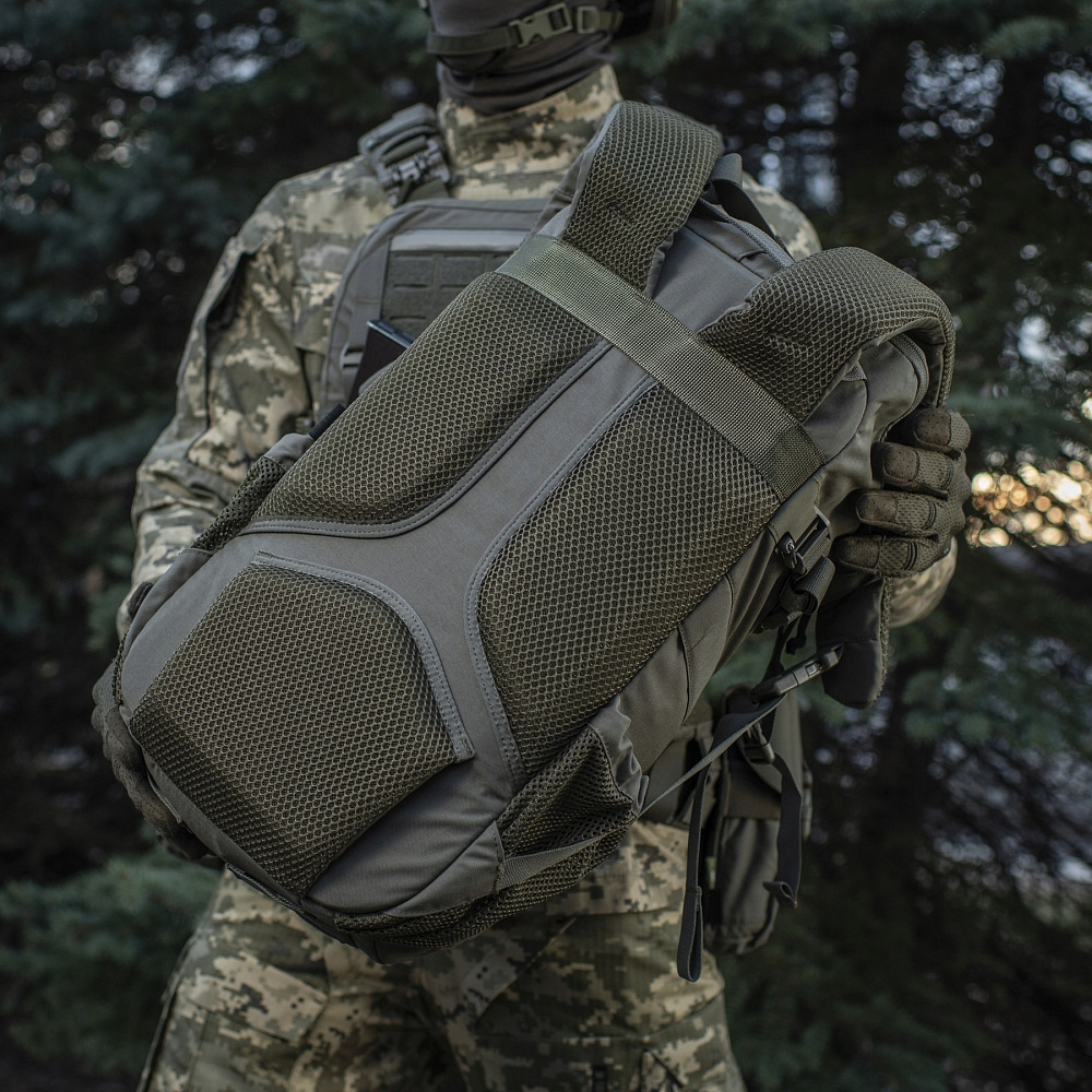 System montażowy MOLLE/PALS na froncie i bokach oraz pasy kompresyjne umożliwiają dowolną rozbudowę plecaka o dodatkowe ładownice i zasobniki. Pasy kompresyjne pozwalają dostosować objętość plecaka do ilości sprzętu, zachowując jego stabilność.