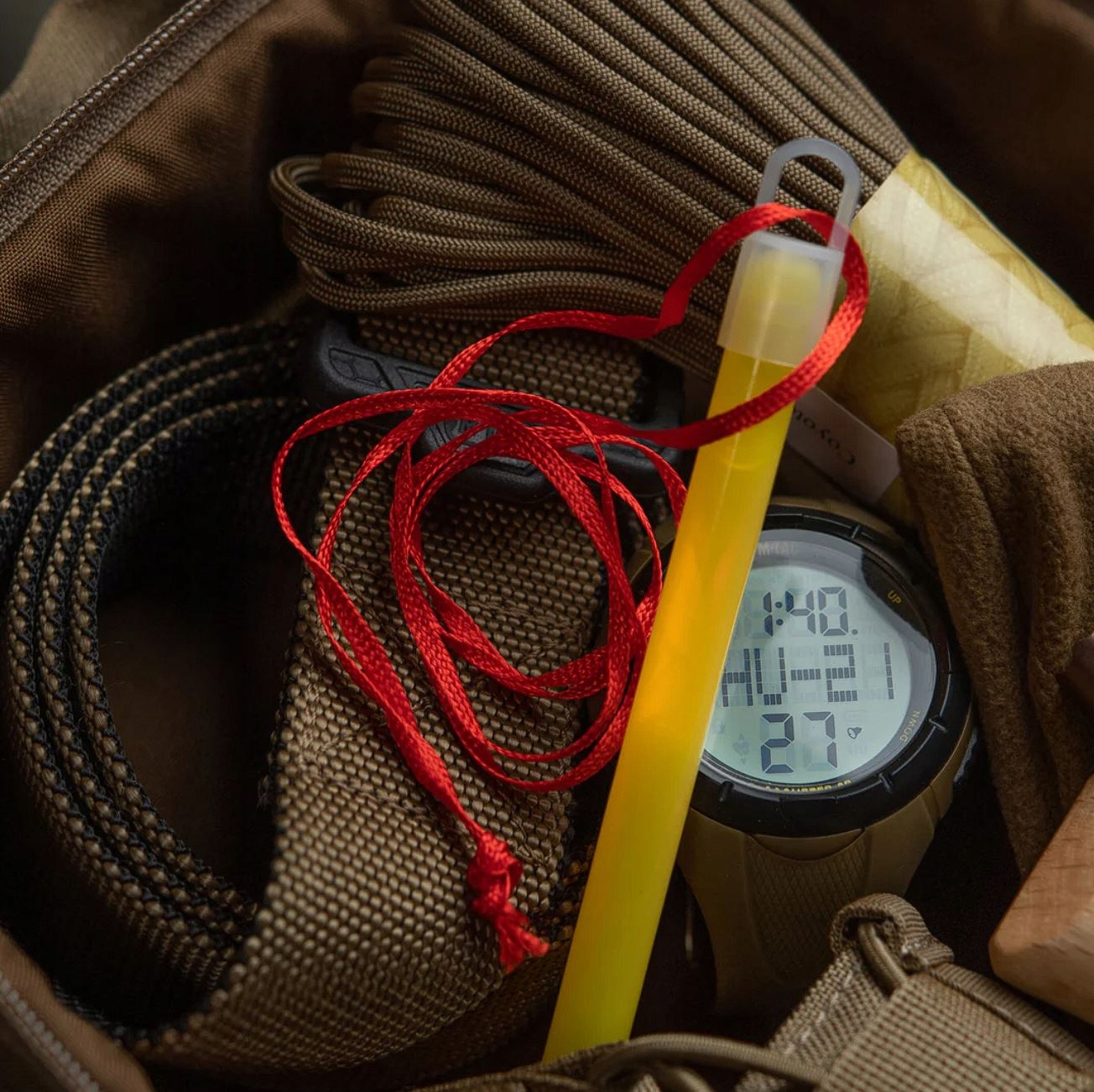 W zestawie znajduje się czerwony sznurek do zamocowania światła na różnych przedmiotach.